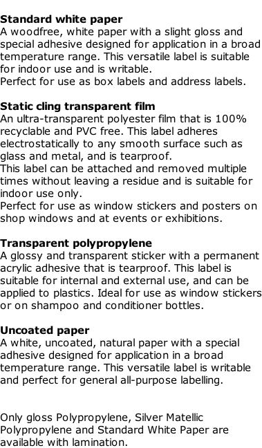 From a self adhesive vinyl or a digital polyurethane for outdoor use to matt/gloss paper or uncoated paper for indoor use only.